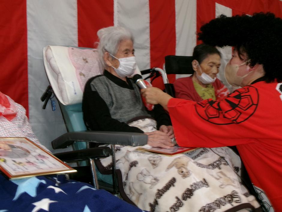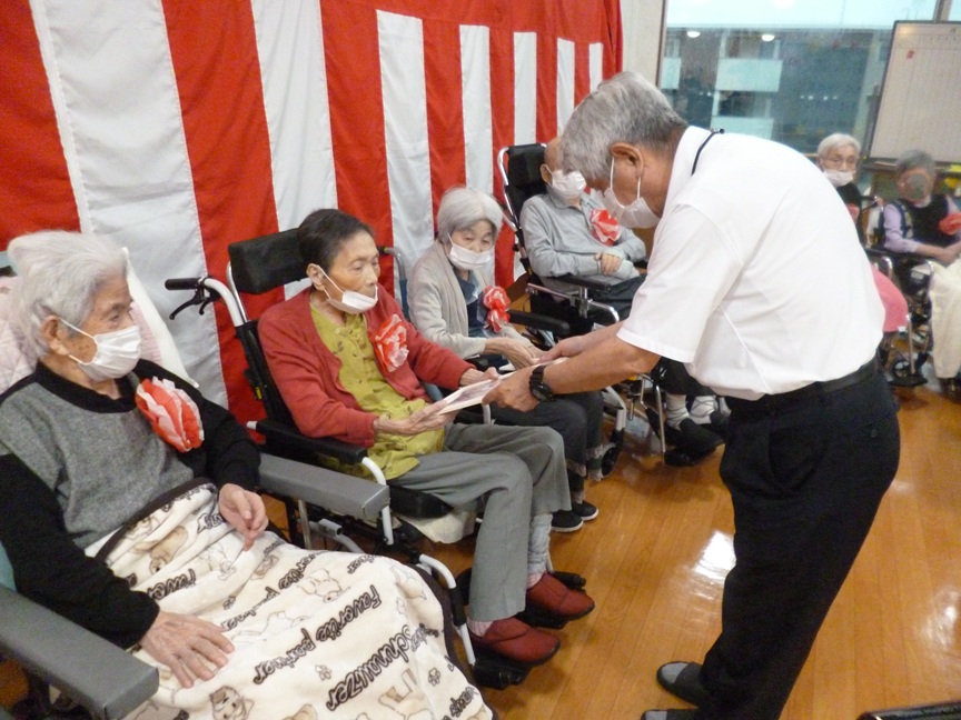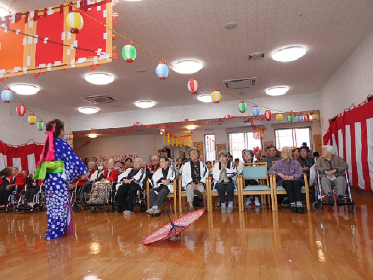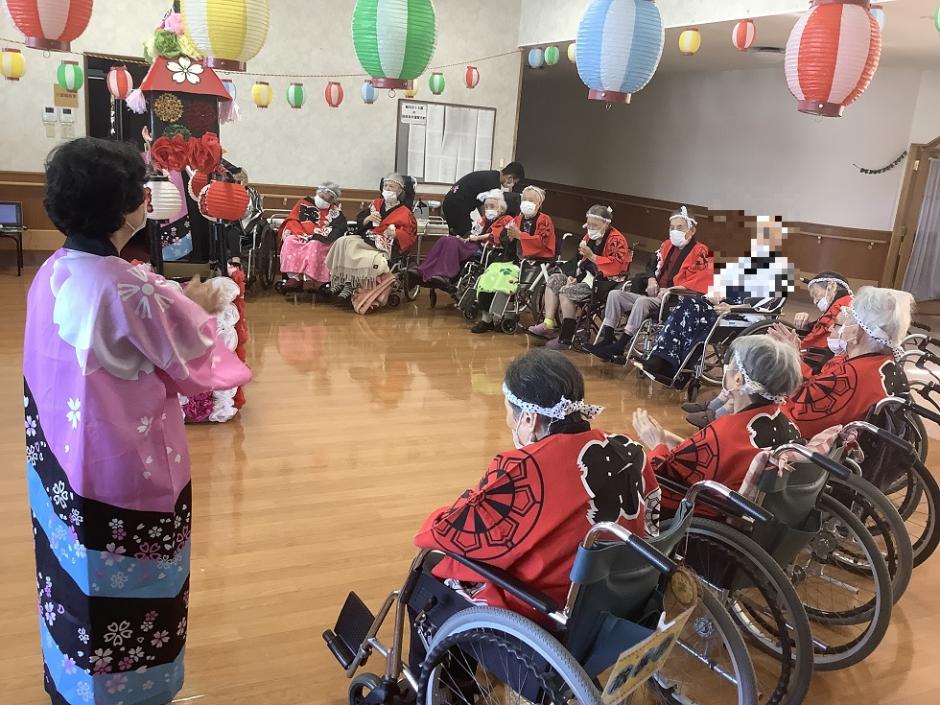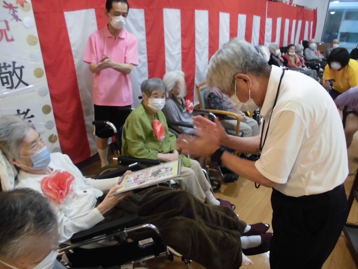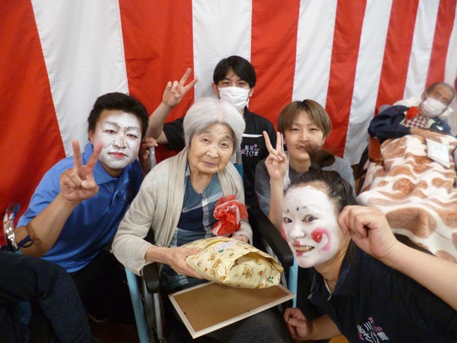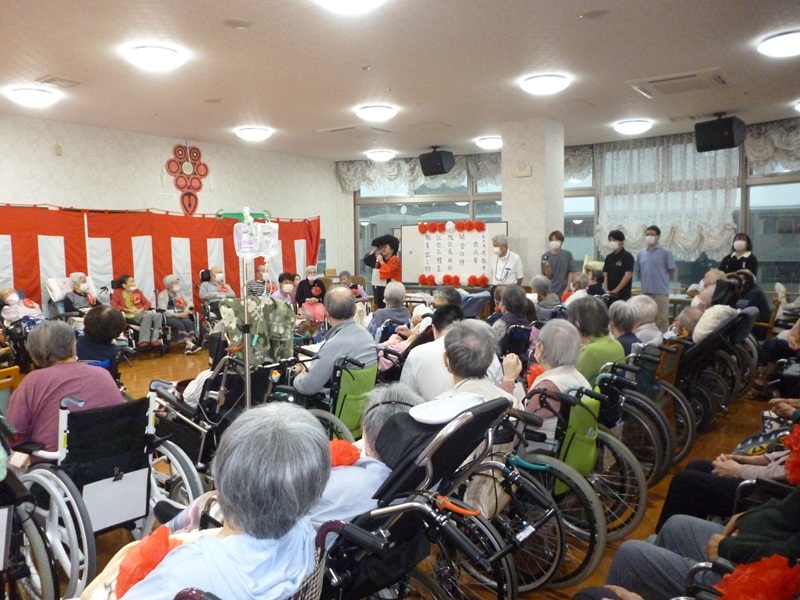 「入居者様も職員もみんなで楽しむ」をテーマに、前半は式典で皆さまの健康に感謝とお祝いを、後半は職員の余興で楽しんでいただきました。