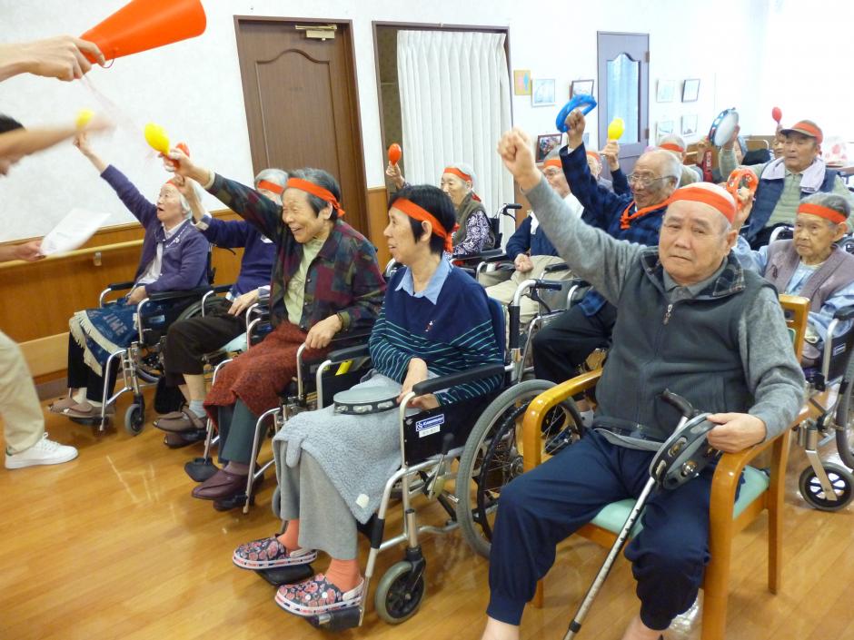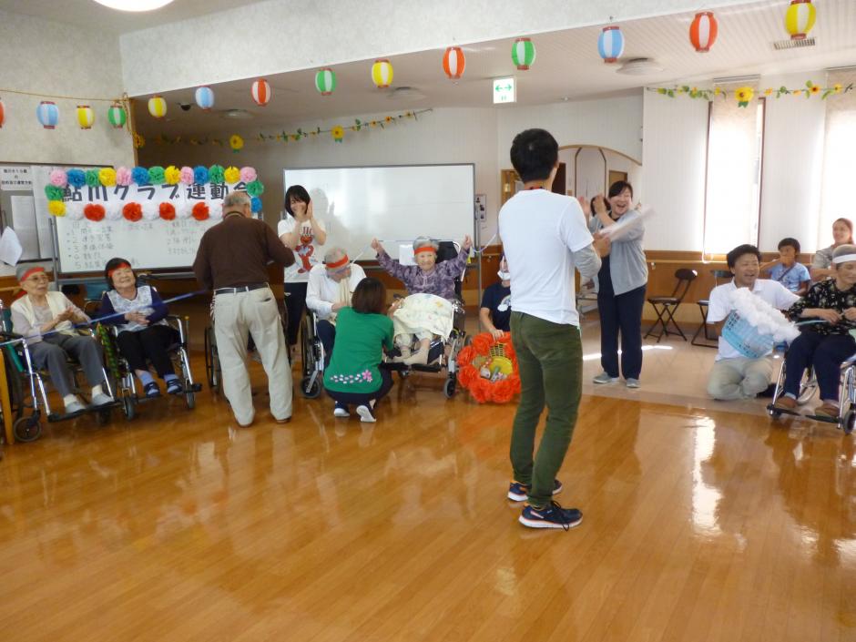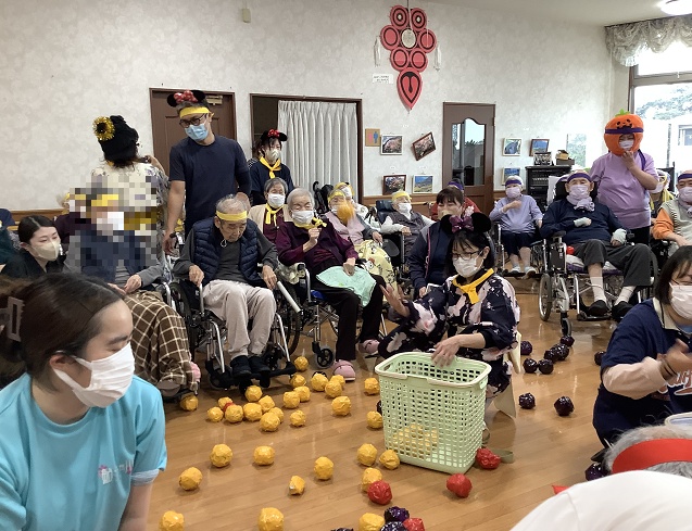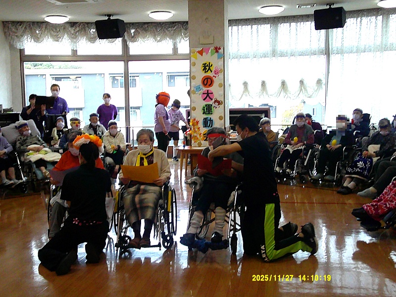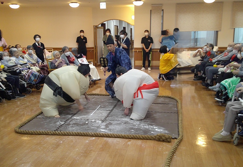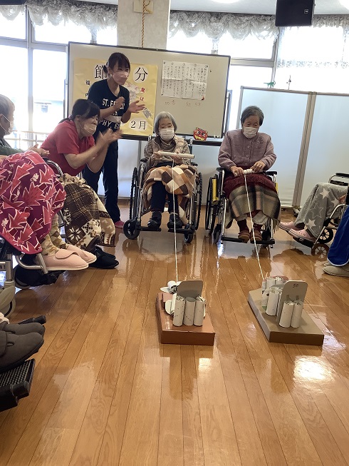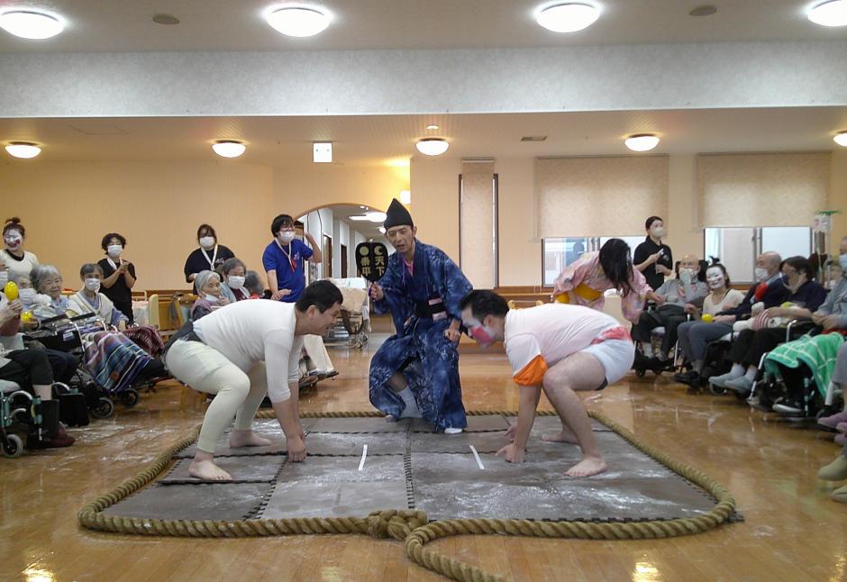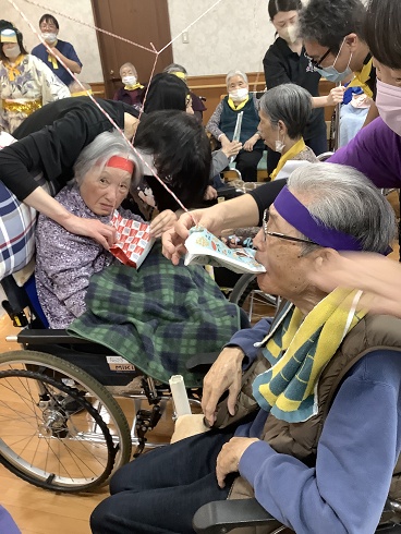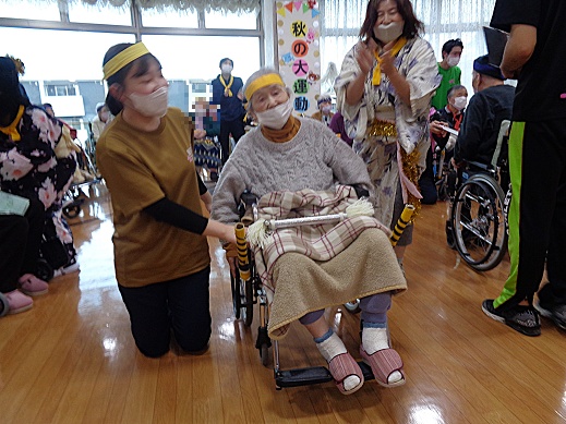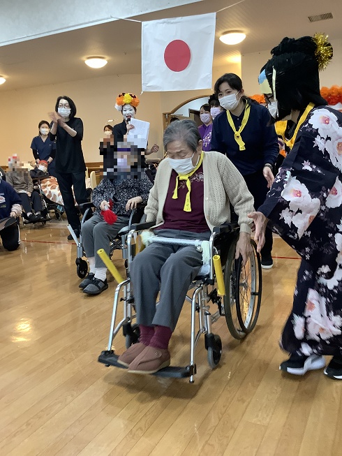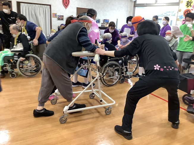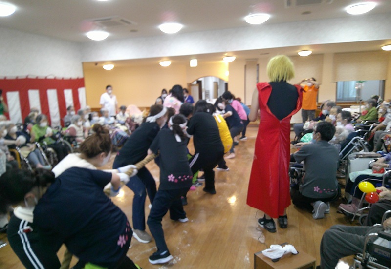 職員の余興は、紅白に分かれ相撲大会や綱引き合戦、応援合戦に至っては仮装大会と化し、いつもの職員とは違う変わりように入居者様は大笑い🎶