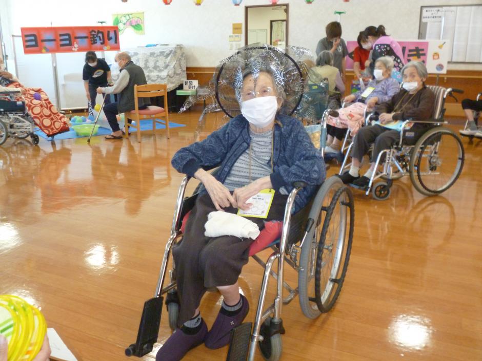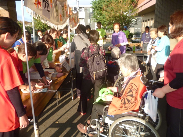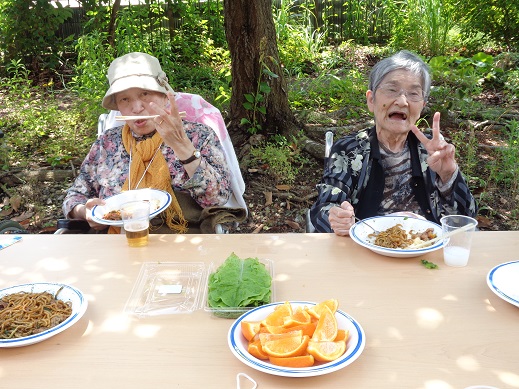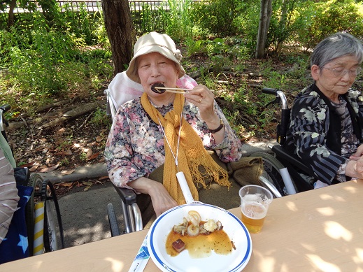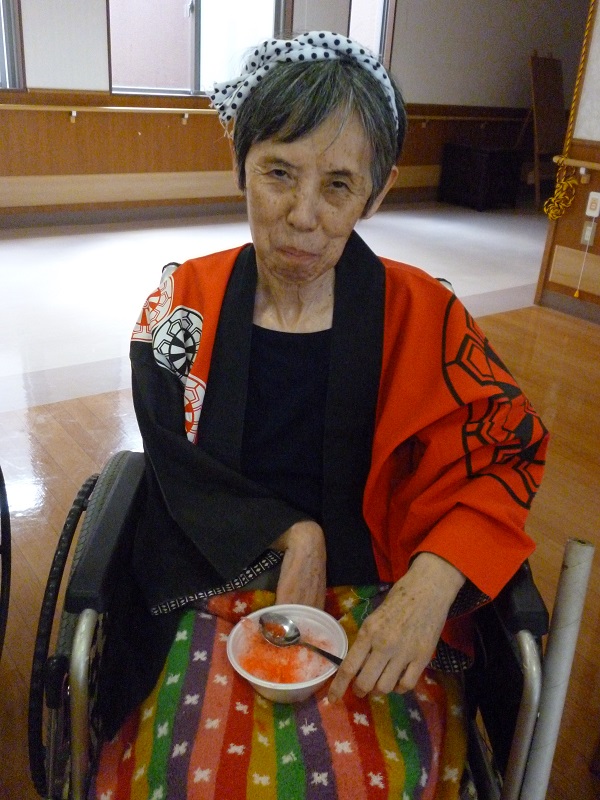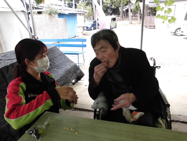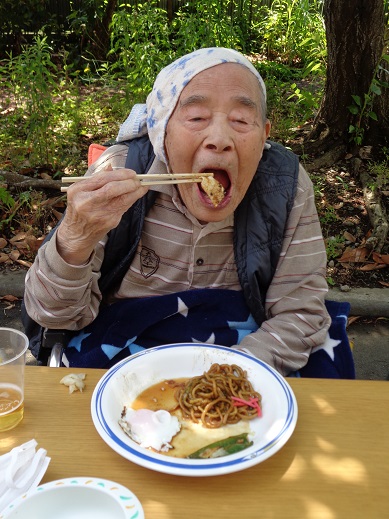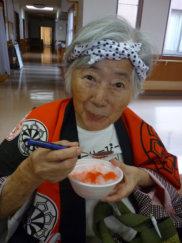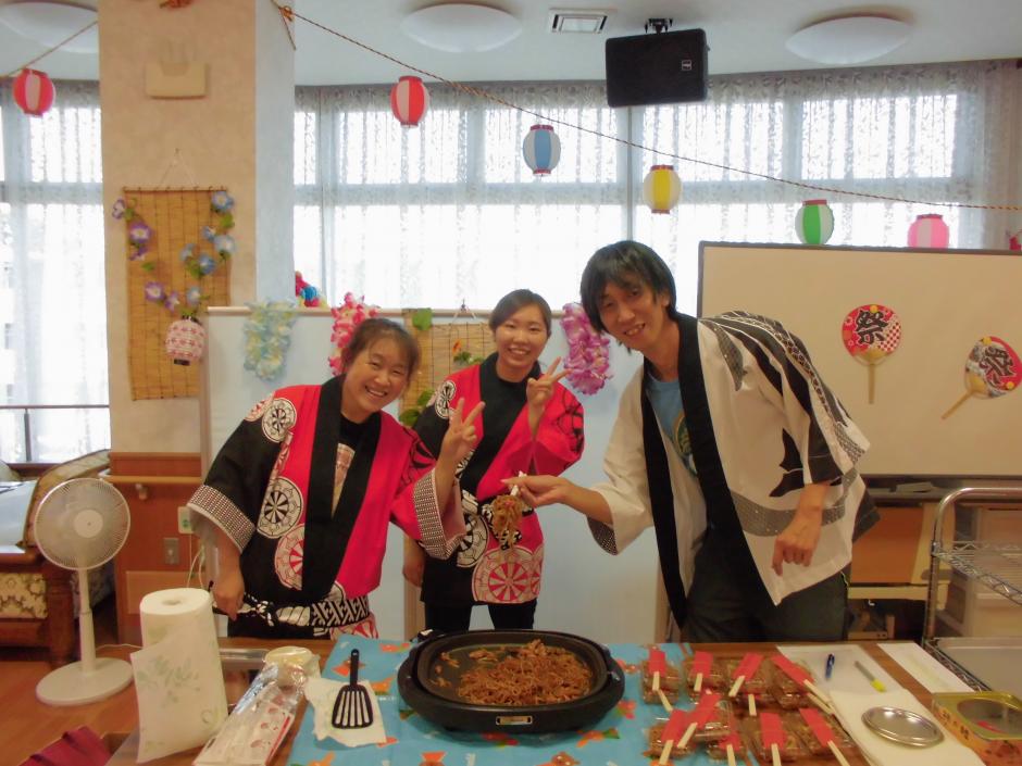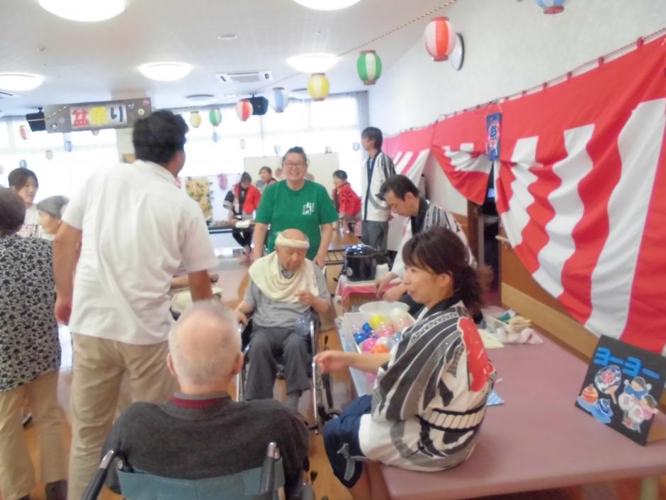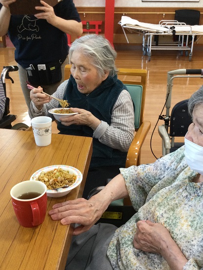 午後の部は縁日の定番、焼きそば、焼き鳥、たこ焼き、フランクフルト、そして枝豆を味わって頂きました。職員が、目の前で焼いた焼きそばは、「熱々で美味しいわ」と好評いただきました。