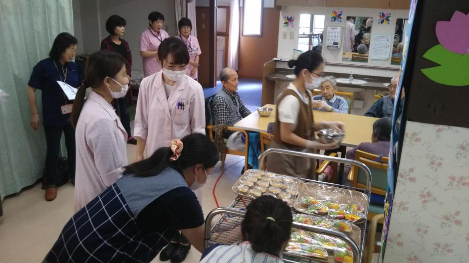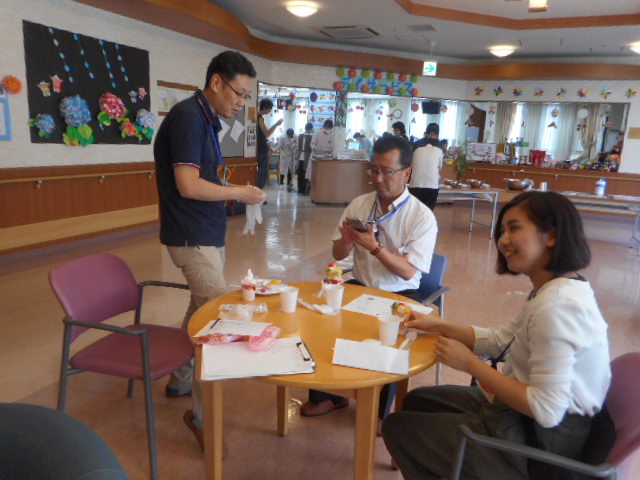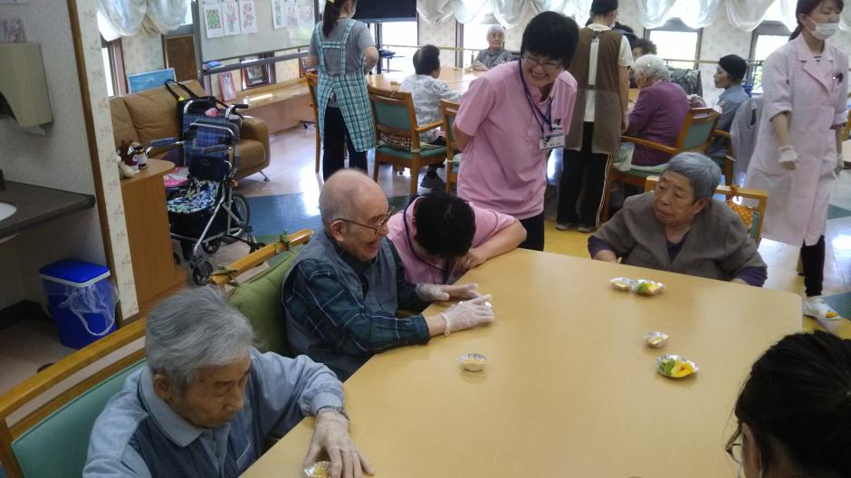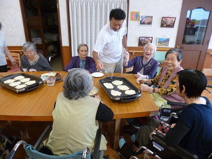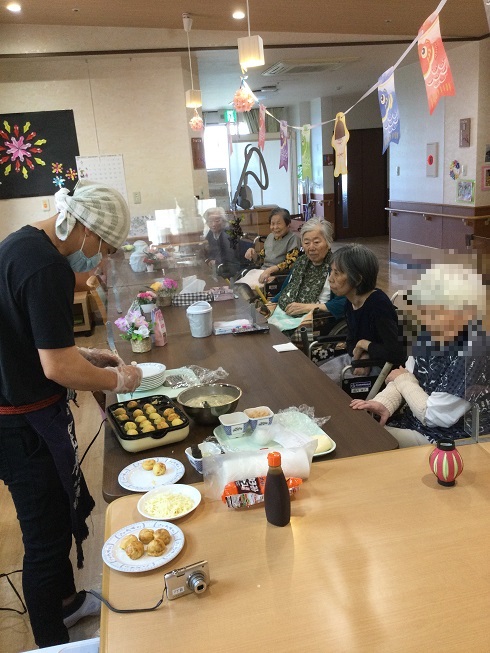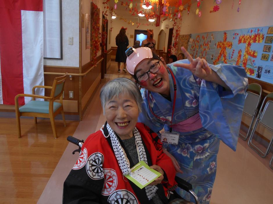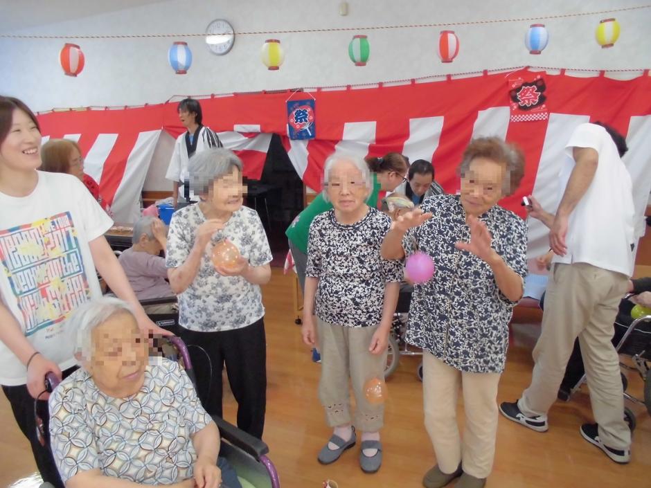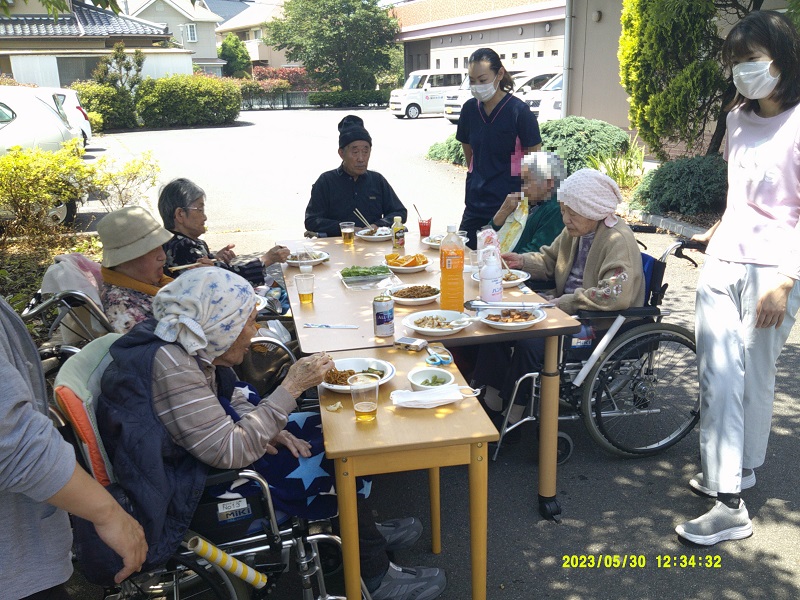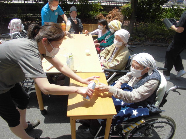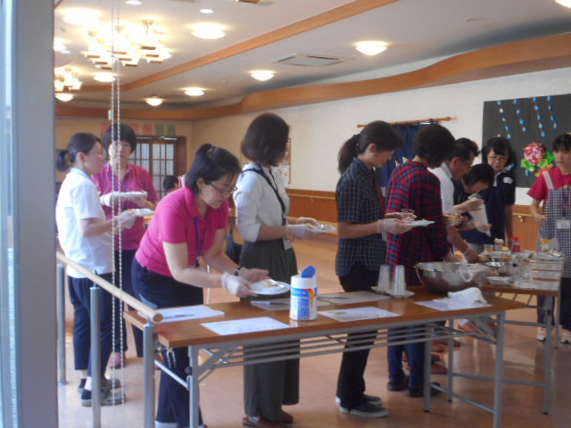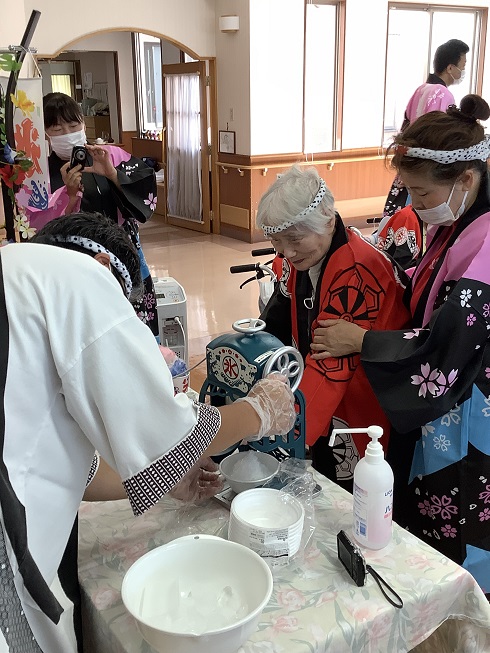 午後の部は縁日の定番、焼きそば、焼き鳥、たこ焼き、フランクフルト、そして枝豆を味わって頂きました。職員が、目の前で焼いた焼きそばは、「熱々で美味しいわ」と好評いただきました。