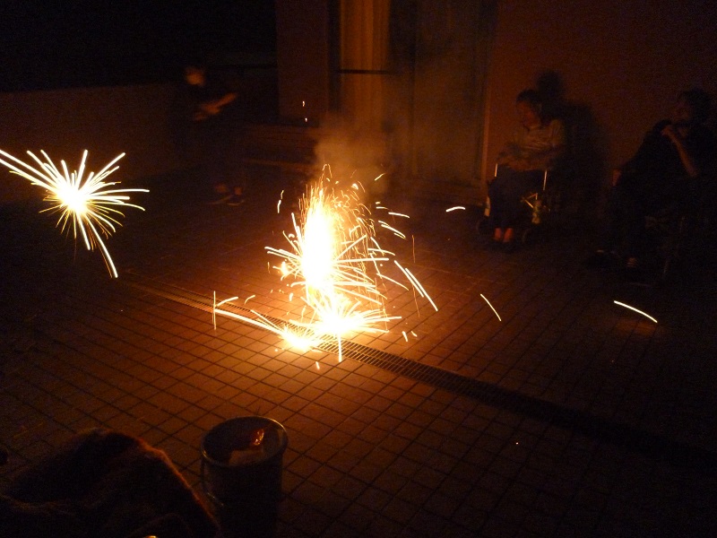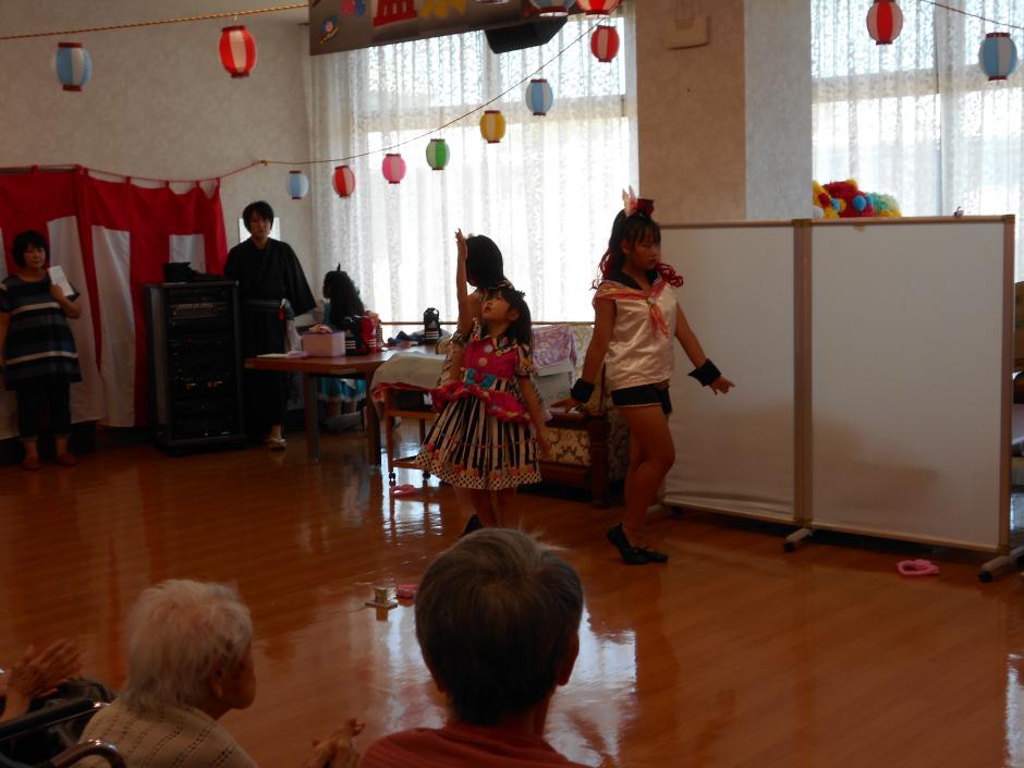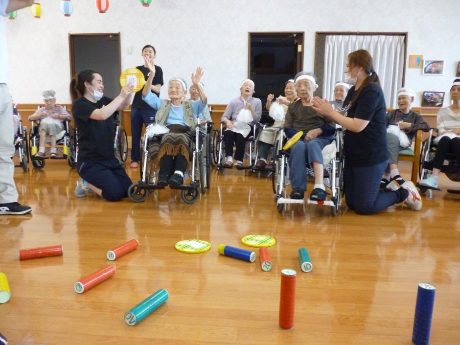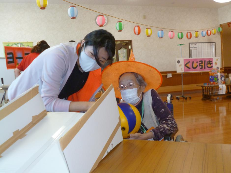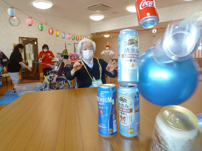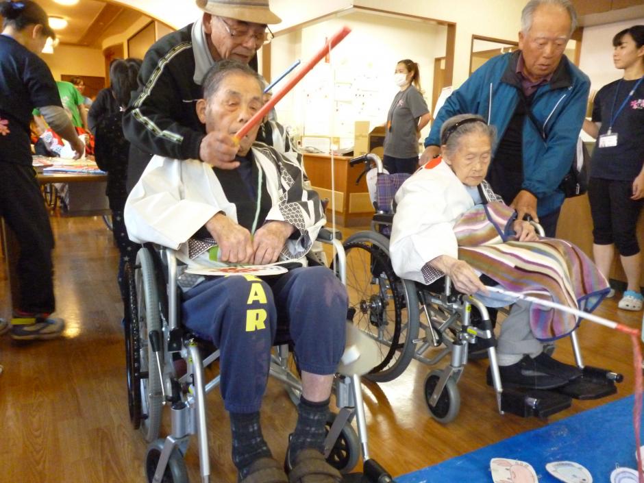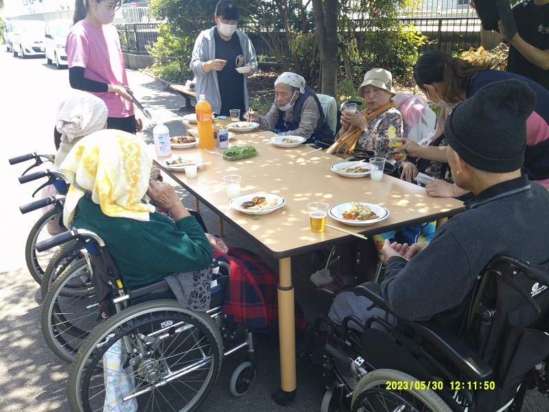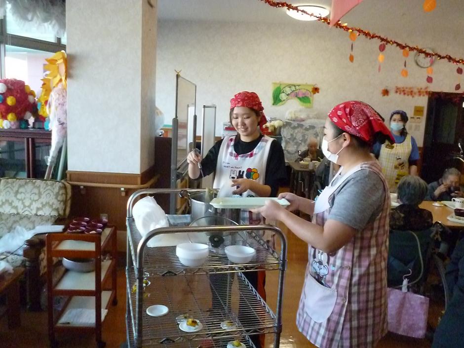 午後の部は縁日の定番、焼きそば、焼き鳥、たこ焼き、フランクフルト、そして枝豆を味わって頂きました。職員が、目の前で焼いた焼きそばは、「熱々で美味しいわ」と好評いただきました。