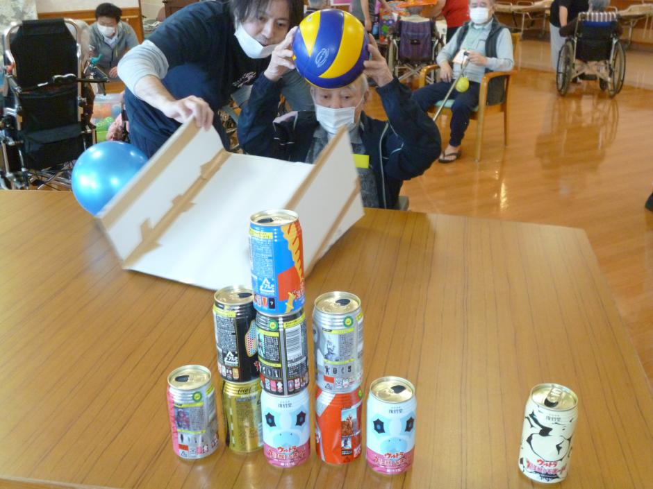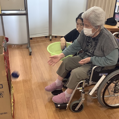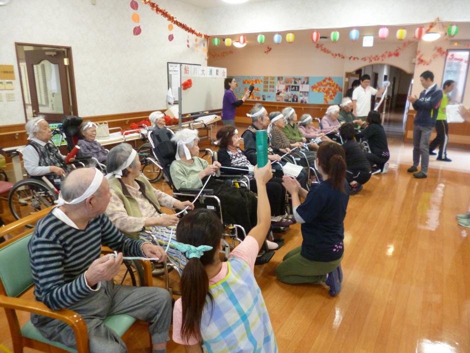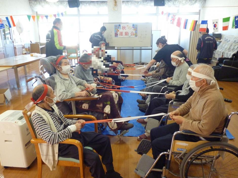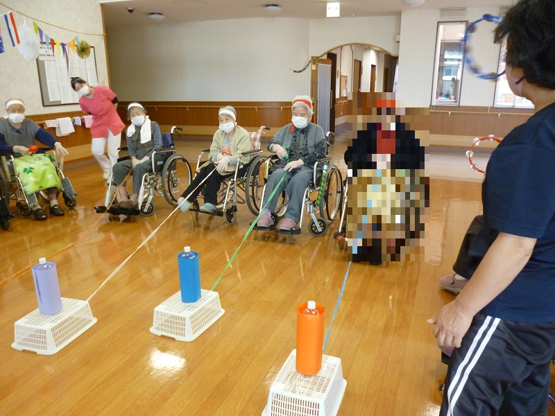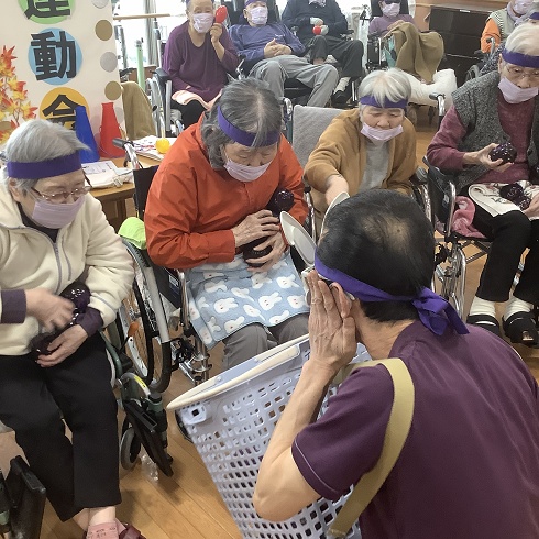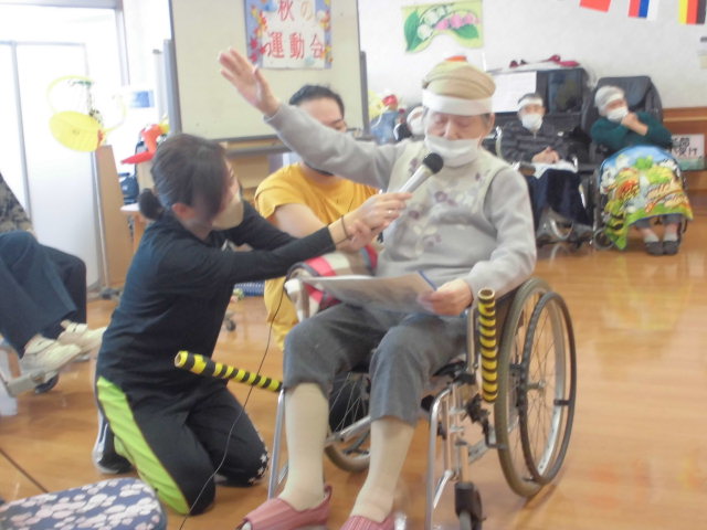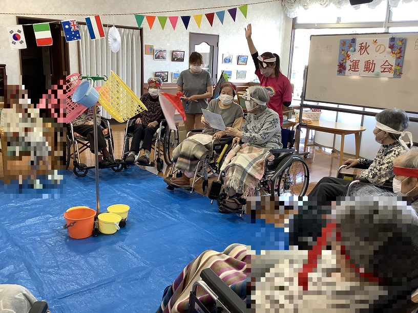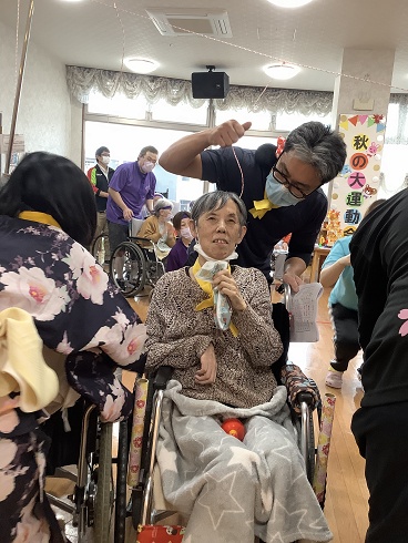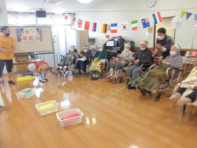 入居者様代表による選手宣誓をはじめ、職員の応援合戦、パン食い競争やリレー、玉入れなど、入居者様全員が参加して楽しめる、賑やかな運動会となりました。