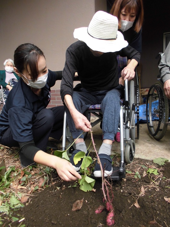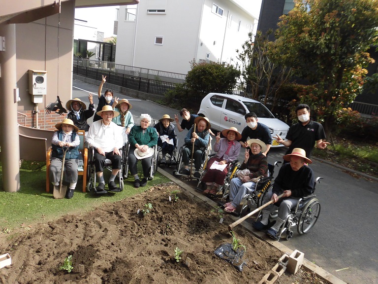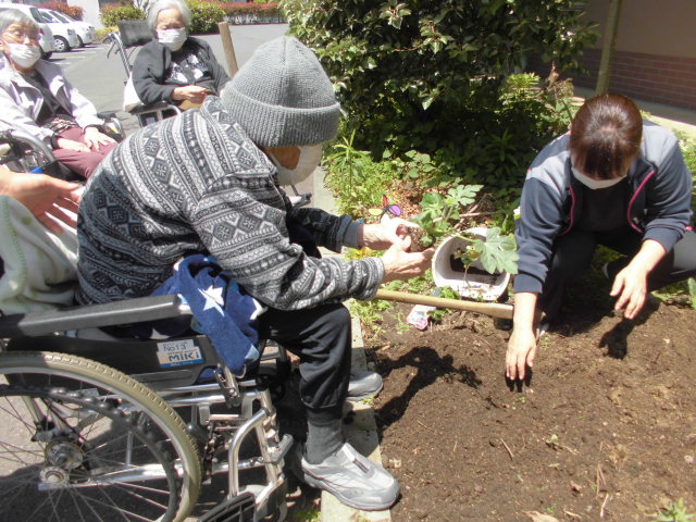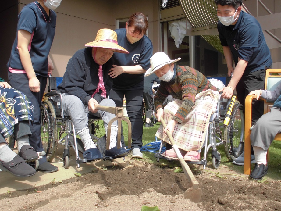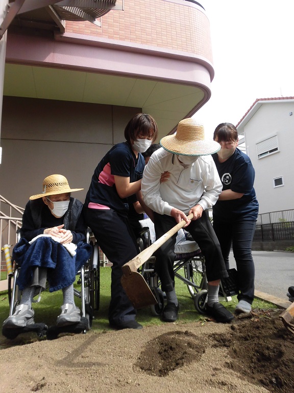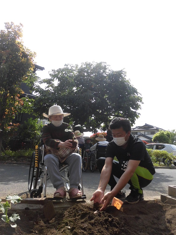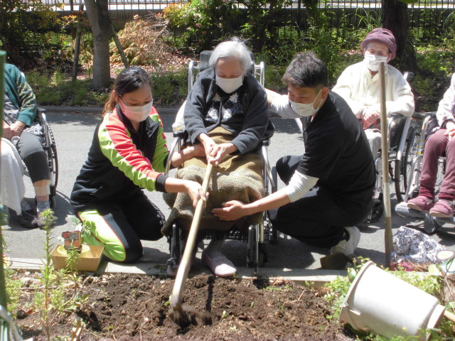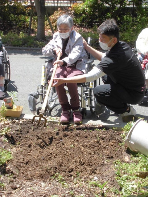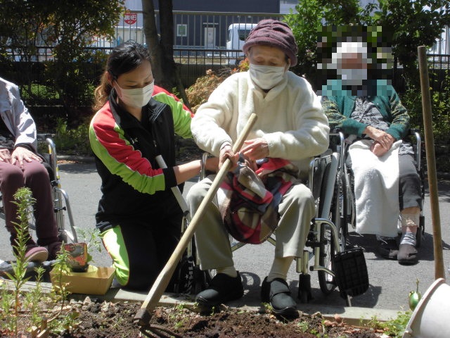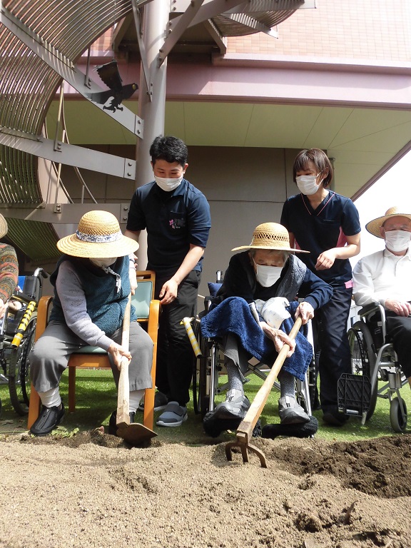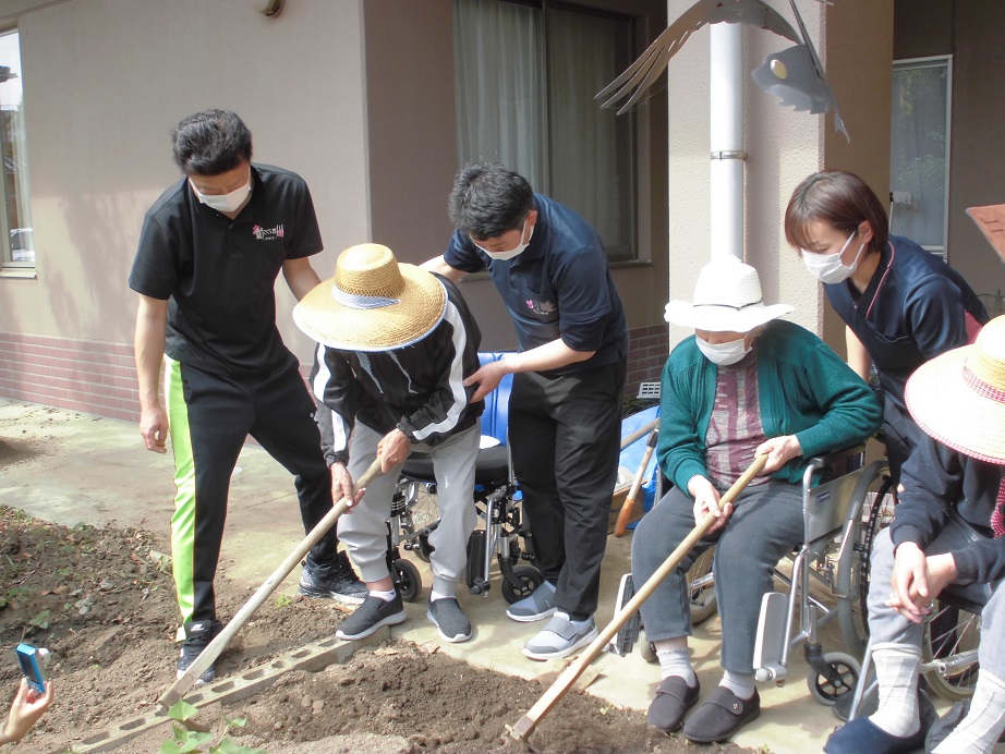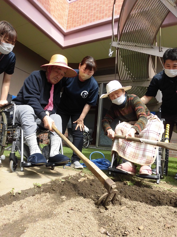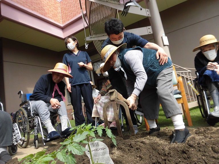 土作りから草引き、水やりや支柱の補強まで、暑い夏の作業には、看護師さんや運転手さん、おそうじさんなど、たくさんの職員が協力してくれました。