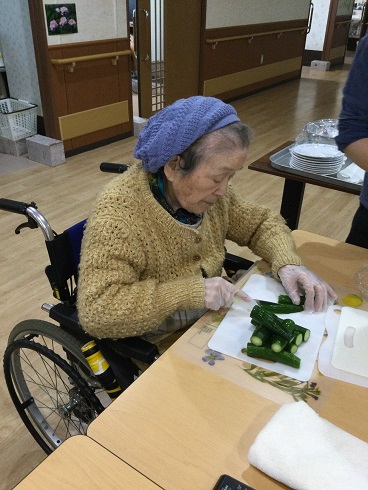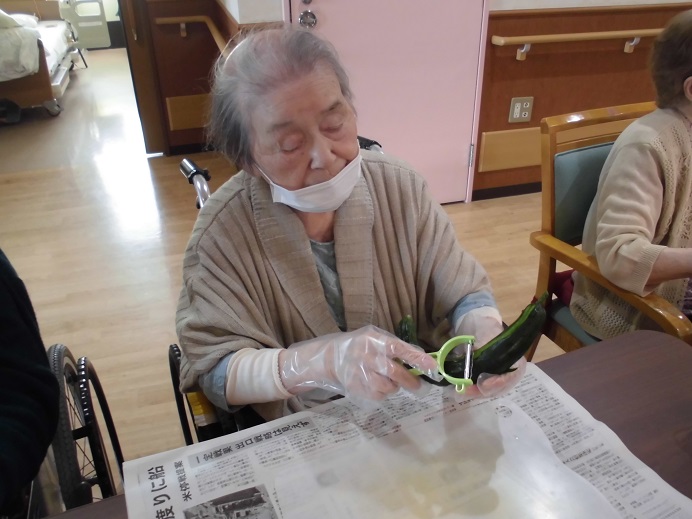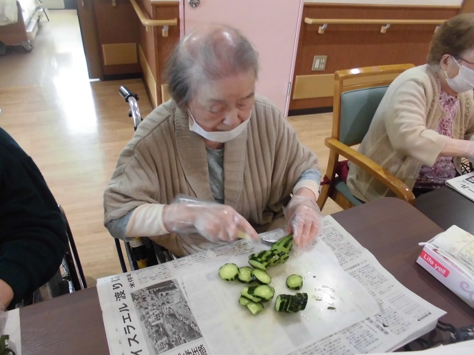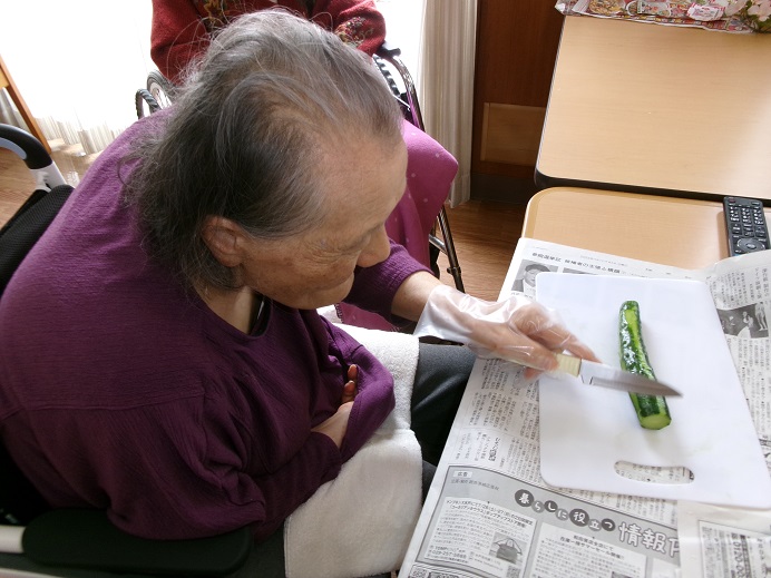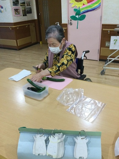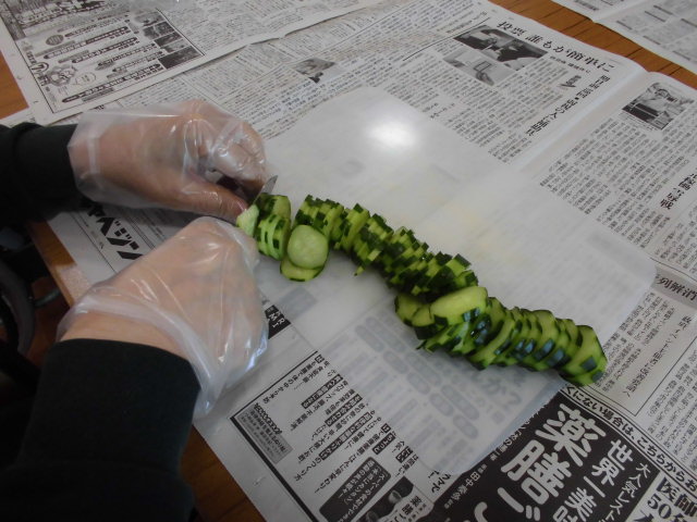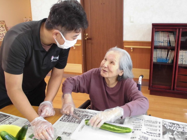生地作りから力いっぱい捏ねて、立つ、足踏みするなど、リハビリしながらのうどん作りで一石二鳥です。畑で収穫したきゅうりとトマトを薬味に加え、ナスで浅漬けを作り、おいしく完食されました。