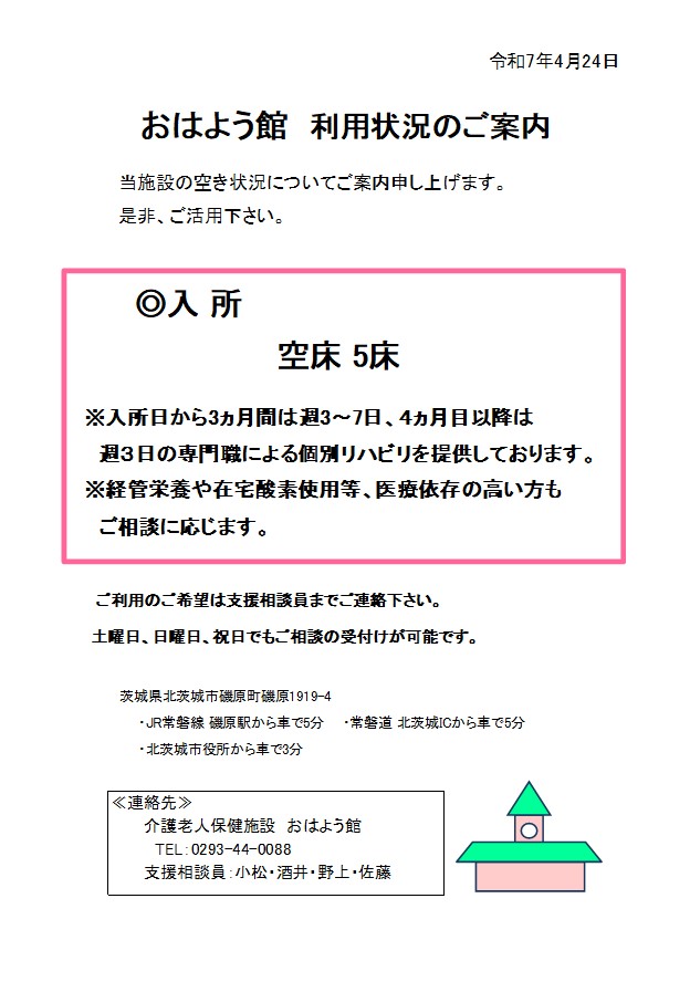 このページでは入所サービスの空床状況を随時更新いたします。是非ともご活用下さい。