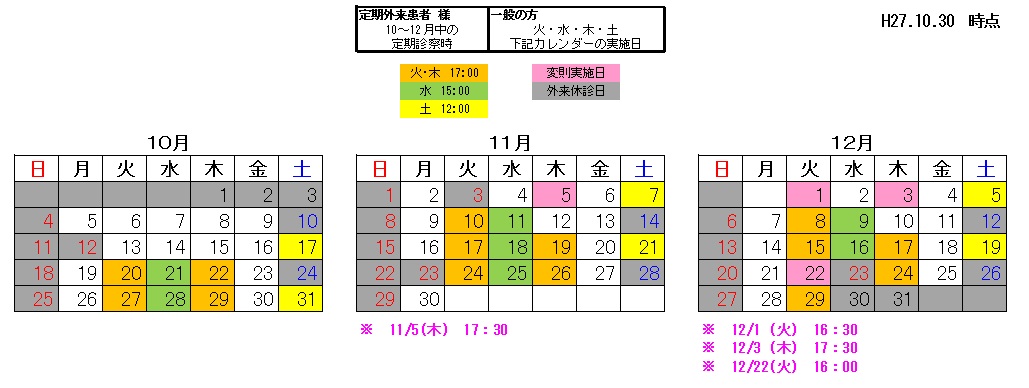 11/5(木)、12/3(木)、12/22(火)のお時間が変更となりました。