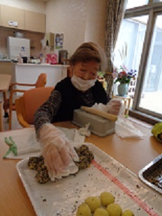 今年は、皆様の健康に感謝しながら・・・お芋を蒸かして、つぶして、ひとつひとつ丁寧にまるめたお団子に、ゴマをまぶして、完成。