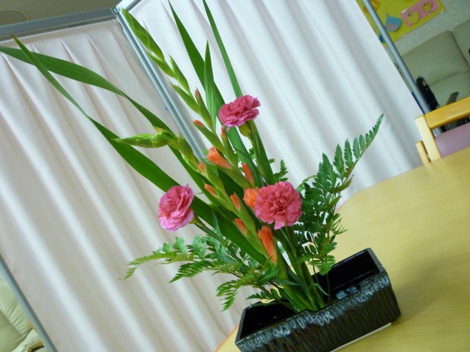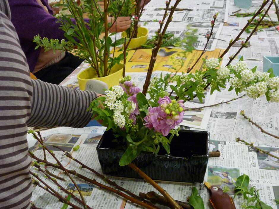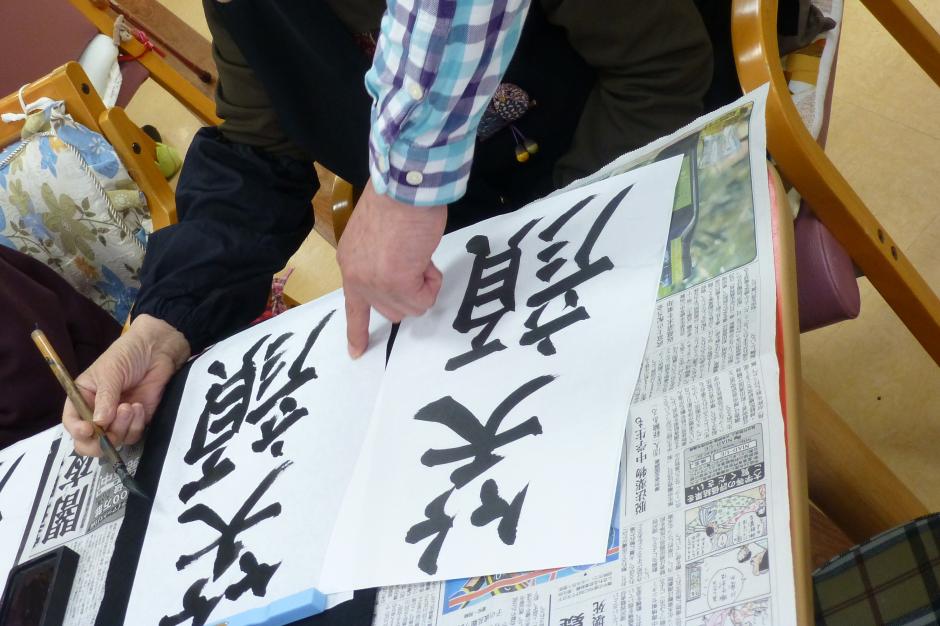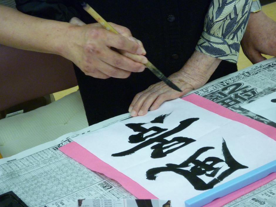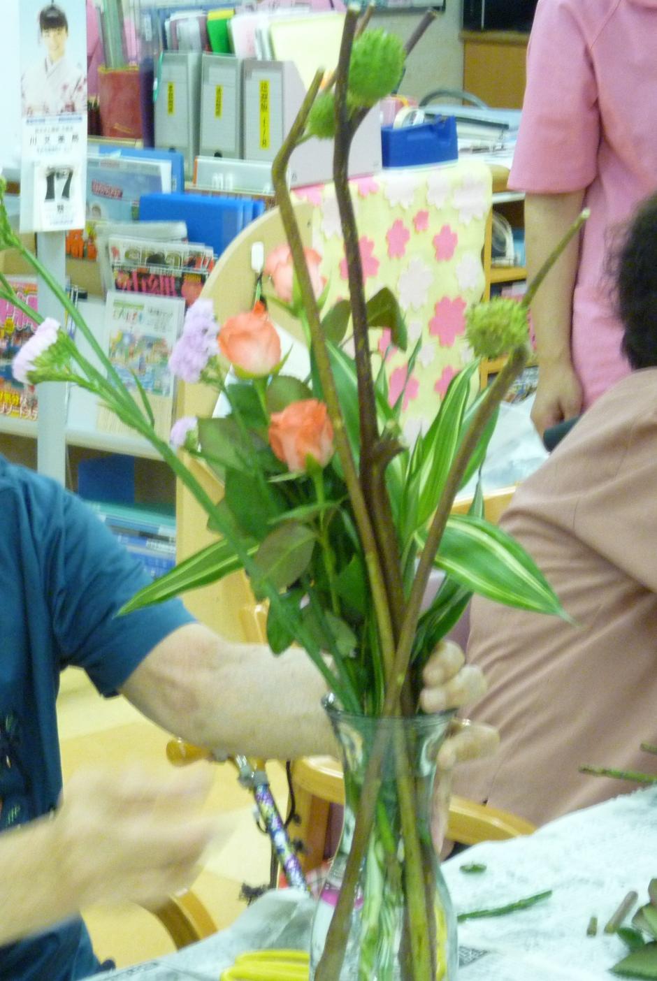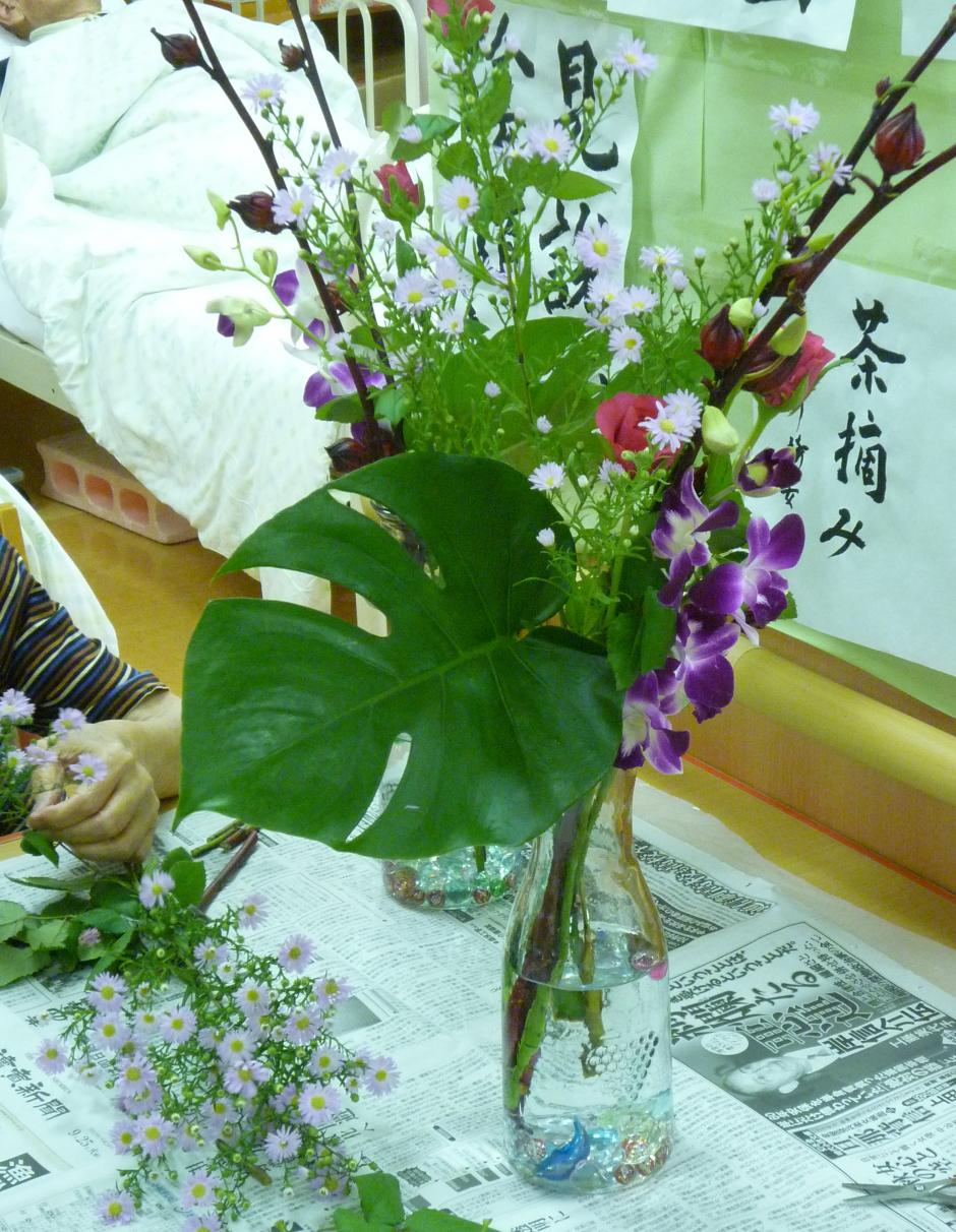 久しぶりに筆に触ったという利用者さんは、緊張した面持ちでチャレンジされていました。生け花教室は男性の方も参加されており熱心に先生のアドバイスに耳を傾けていました。