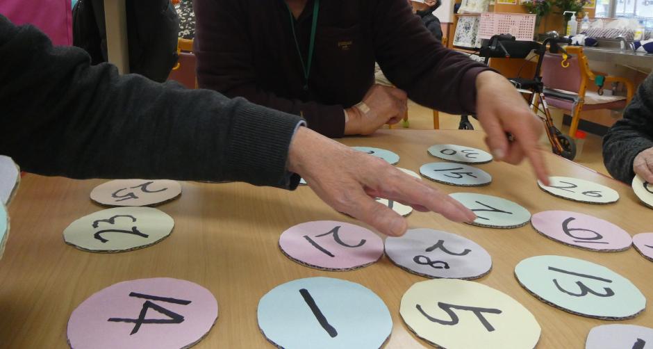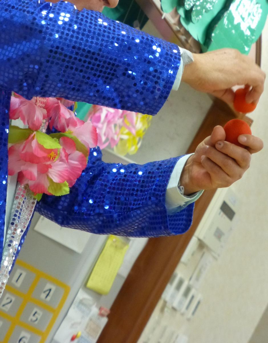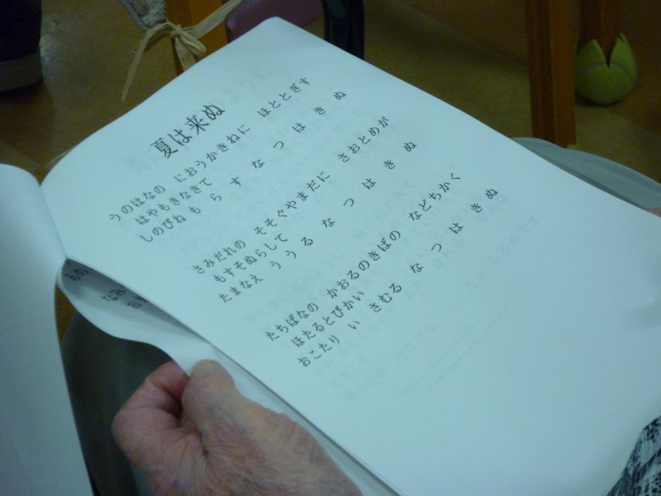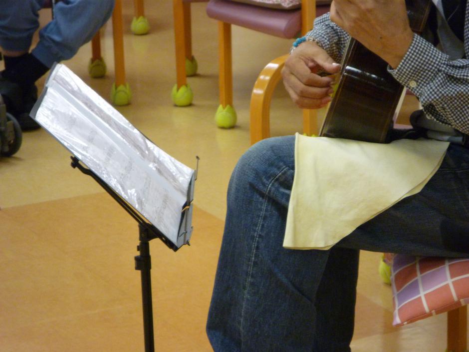 本日5月17日(金)は、「楽器を奏でよう」という行事を行いました。長山ケアマネジャーのギター演奏に合わせ、紙コップやペットボトルに大豆を入れた楽器を持ち、チーム毎に演奏しました。つい歌ってしまい手が止まり、それも楽しく、「いつでも夢を」の曲では、簡単な手話をしながら歌を歌いました。感染予防でお席の間隔を空け、マスクをしての演奏会となりましたが、表情が明るく良い気分転換となりました。