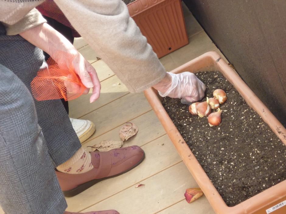 先日川島院長からもらった「チューリップ」の球根を、プランターに春の開花を祈りながら植えました。来年の春が楽しみですね。