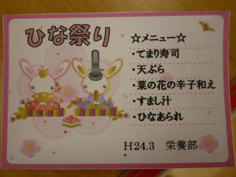 今日はひな祭りということで栄養部からお昼ご飯にメニューのカードが添えてありました。