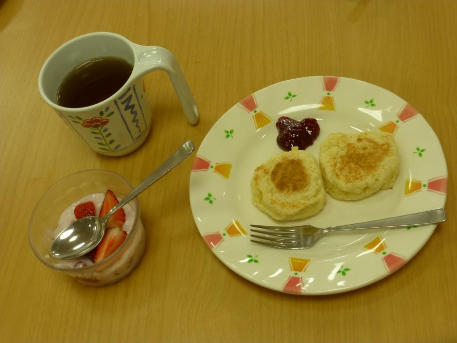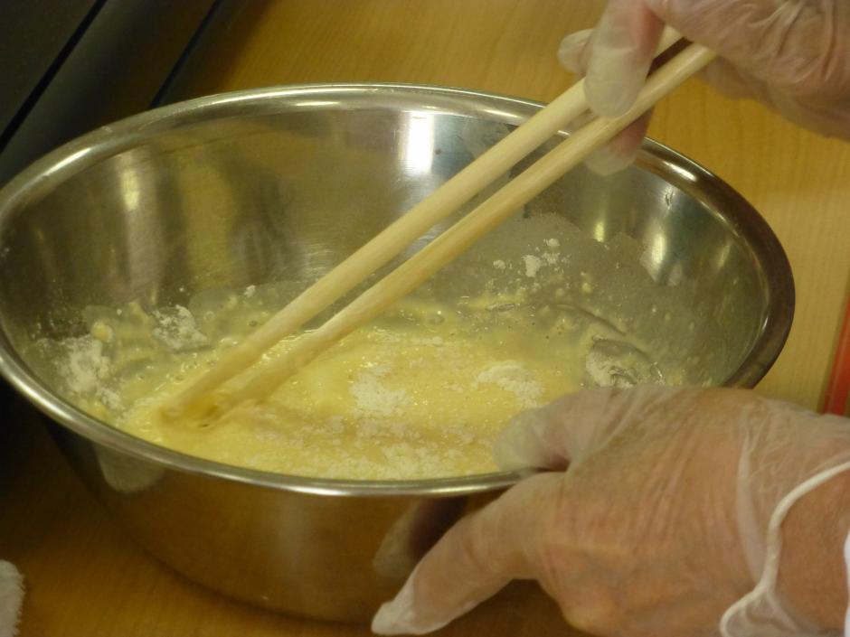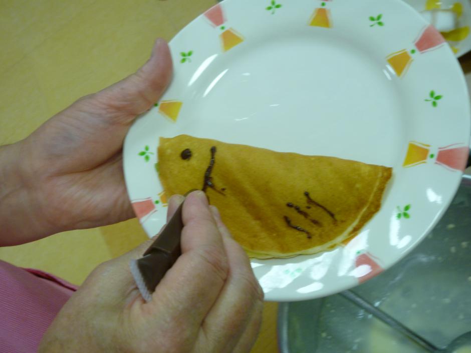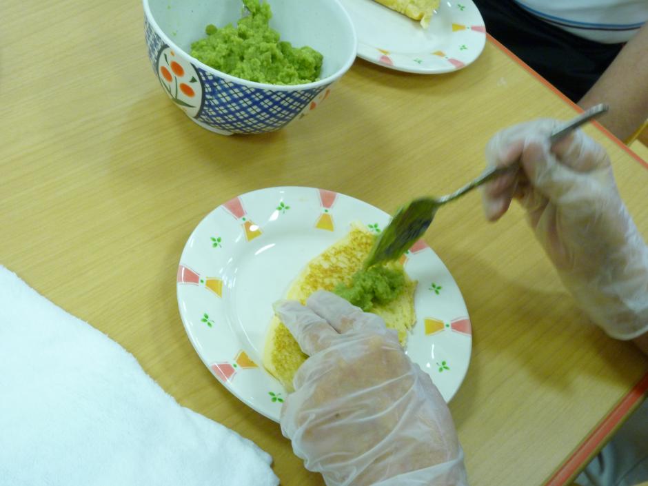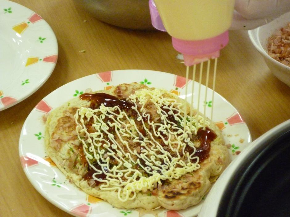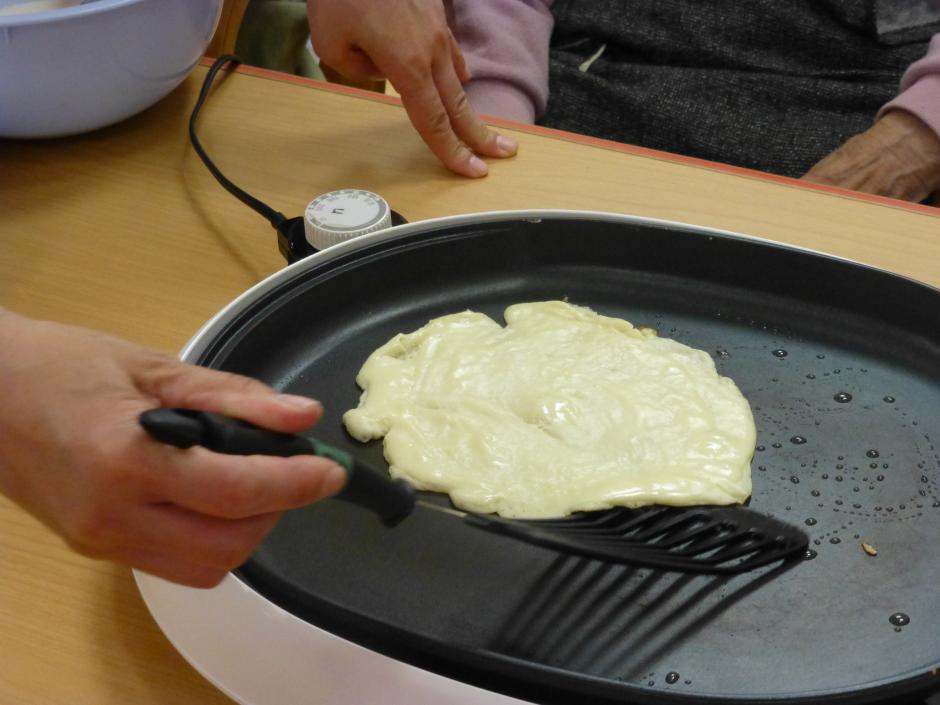 本日は、お好み焼き作りを行いました。初めて召し上がる方が多いのかなと思っていたのですが意外にも「懐かしい」との声が多数上がりました。理由を聞いてみると「“どんどん焼き”って昔は言ったんだよ」というお話や「おれの所は“たらし”って言ってたんだ」と昔を懐かしがりながら召し上がっていただきました。