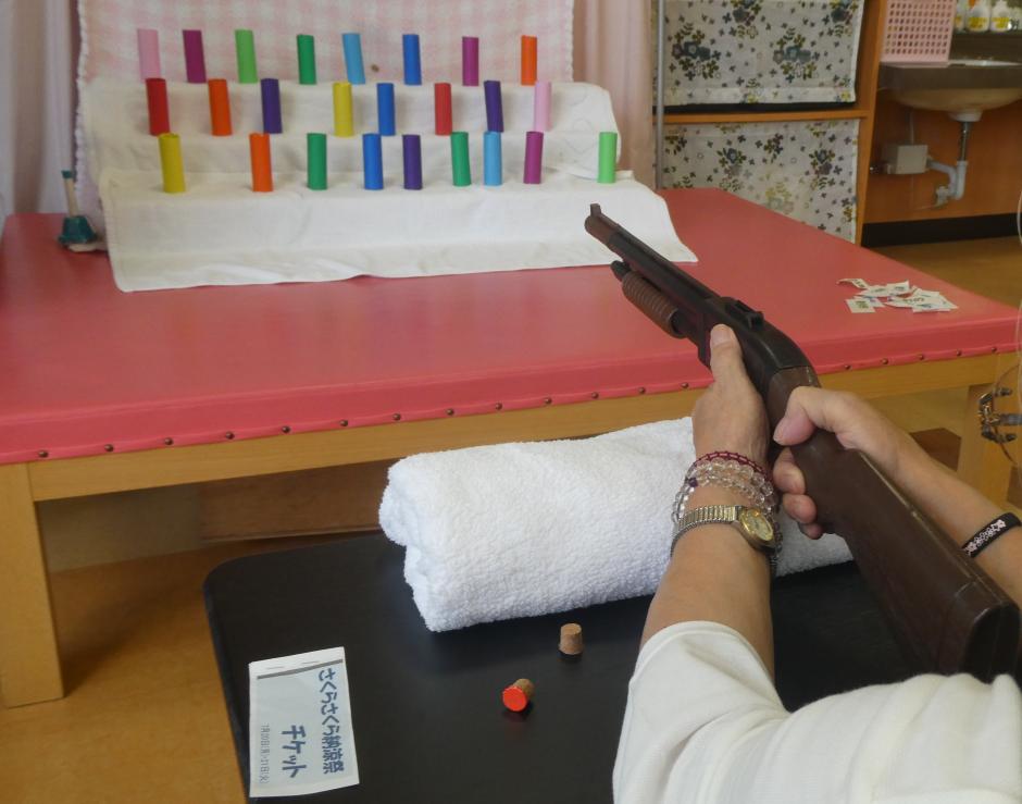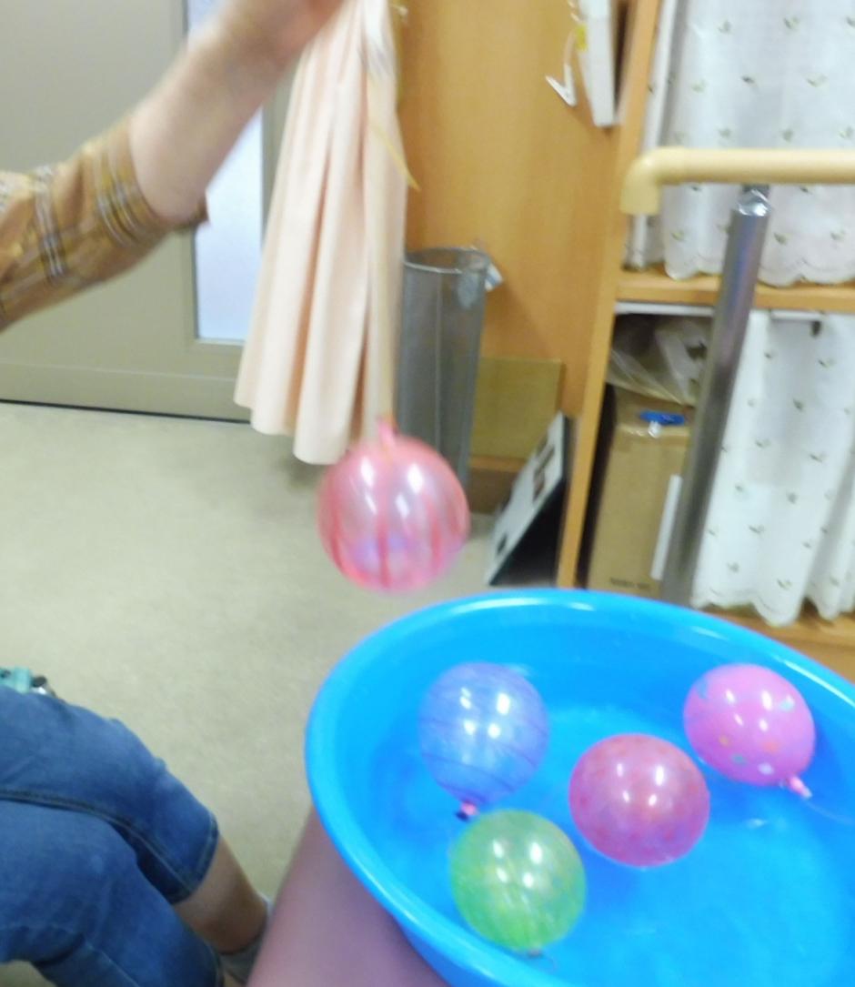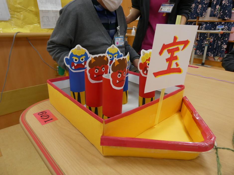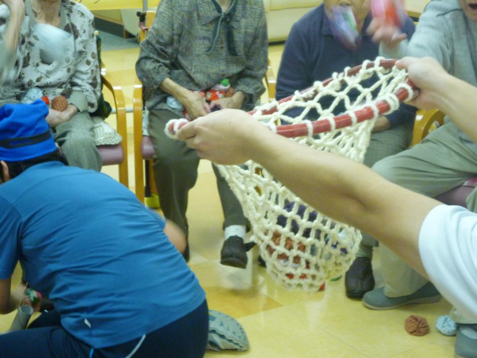 4グループに分かれ4つの競技を行います。競技は一人ずつうちわを仰ぎ風船を飛ばす『風船タワー』🎈、洗面器につけたボールを足踏みをして出す『ポップコーンゲーム』、出題した数字を覚えカードを探す『すうじタッチ』、棒につけた紐を巻きながら宝船を引き寄せる『宝船ゲーム』の4つ!皆様で協力するものや対決式のもの等、競技は様々♪応援や足を使って、手を使ってと普段のリハビリの成果を発揮され、皆さん真剣に取り組まれていました。各競技の優勝者には敢闘賞として景品をプレゼント。そして運試しとして最後にくじを引いて頂き、当たった方には特別賞を差し上げました。景品の中身は…秘密。
