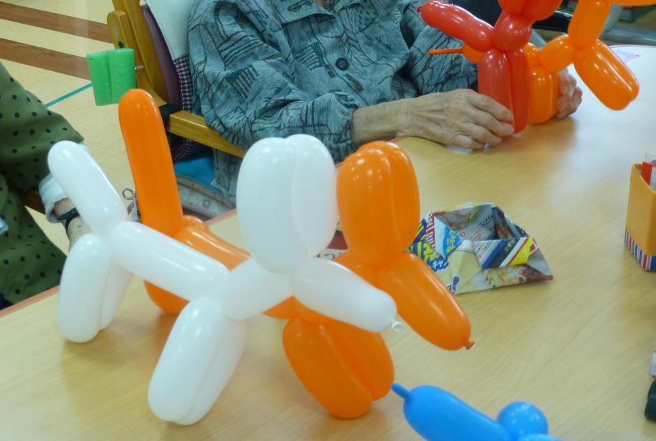 本日、バルーンアート教室を開催し、「苺」を作りました。膨らませた緑色の長い風船をねじり合わせ、苺のへたの部分を作ります。キリキリキシキシと音が鳴り、割れそうで割れない..力を調節しながらおっかなビックリ!!実の部分の赤い風船には、種に見立ててシールを貼り、風船の閉じた部分を合わせて美味しそうな苺が完成しました。「可愛い苺が沢山出来て、食べたくなっちゃったね」と素敵な笑顔が見られました。