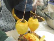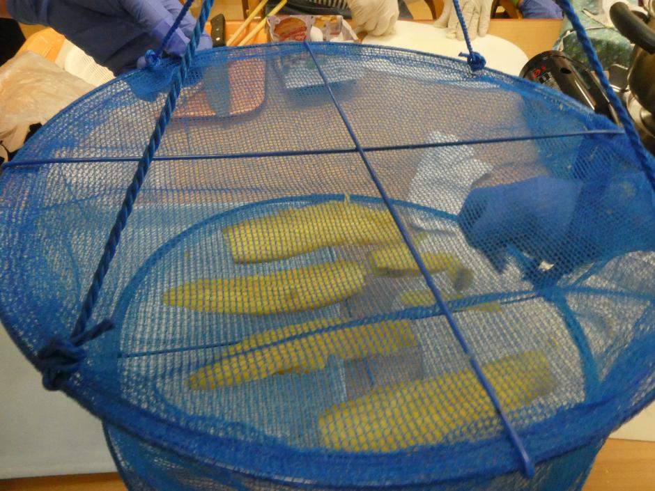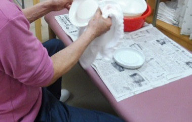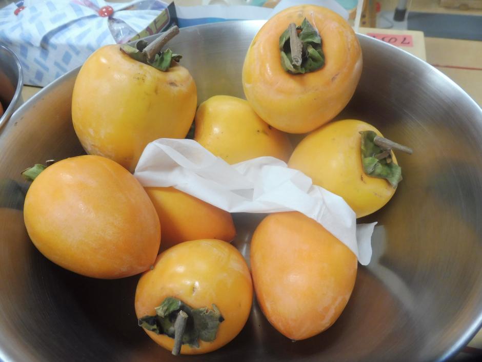 秋も一段と深まり日だまりの恋しい季節となりました。午後の活動時間にさくらの料理教室「干し柿作り」を行いました。渋柿のへたを残し皮をむき紐にへたをくくりつけ、殺菌のため渋抜き用アルコールを柿に振りかける作業を行いました。作業中は皆さんから干し柿を作った思い出話が聞かれ和やかな雰囲気で行われています。ご自宅では日が当たり、雨の当たらぬ風通しの良い所に干して下さい。