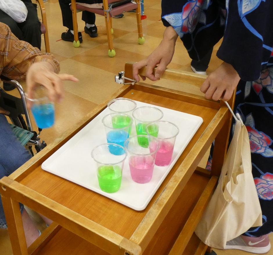 8月4日〜5日の2日間にわたって「知っておきたい入浴の健康効果教室」を行いました。勉強会ではクイズや入浴前後におすすめの飲み物やぜりーの作り方を説明させて頂きながら皆さんに試飲してもらいました。その際美味しそうに味わって下さいました。その他にも浴槽を跨ぐ動作の体操を行い集中されながら取り組まれていました。入浴にはリラックス効果もあるため気分転換にもなりますよ。