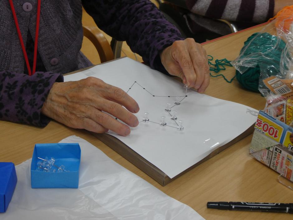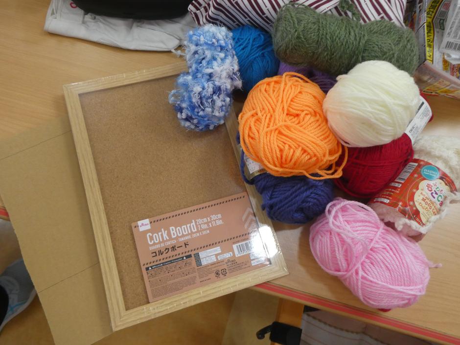 コルクボードにお手本通りのピンを刺し毛糸を巻き付けて模様を作ります。細かい指先の動きが必要となる為、指先のリハビリも兼ねたイベントとなっています。利用者の皆様方は好きな色の毛糸を選び、集中して取り組むことが出来ていました。毛糸を通すピンの順番によって中心の模様が変わり、各利用者様の個性が出る素敵な作品が出来ました。