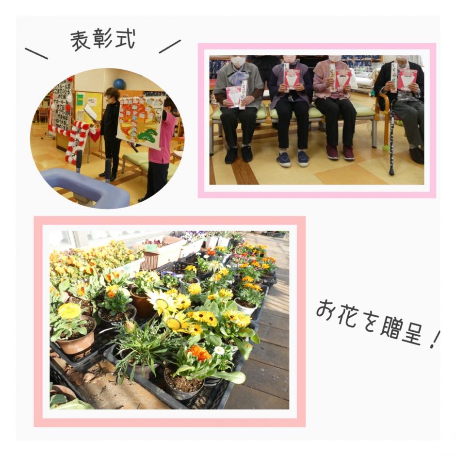 「終業式」を行いました。今年は早咲きで満開の桜のもと式を行うことができました。式の中では皆勤賞やフロア内・屋外歩行へチャレンジされた利用者様への表彰、1年間目標へ取り組まれた皆さんへの終了証の授与とお花をお渡しさせて頂きました。また、1年間送迎のご協力を頂いたご家族様にもヒメリュウキンカをプレゼント!花言葉は『あなたに会える幸せ』、『会える喜び』です。
